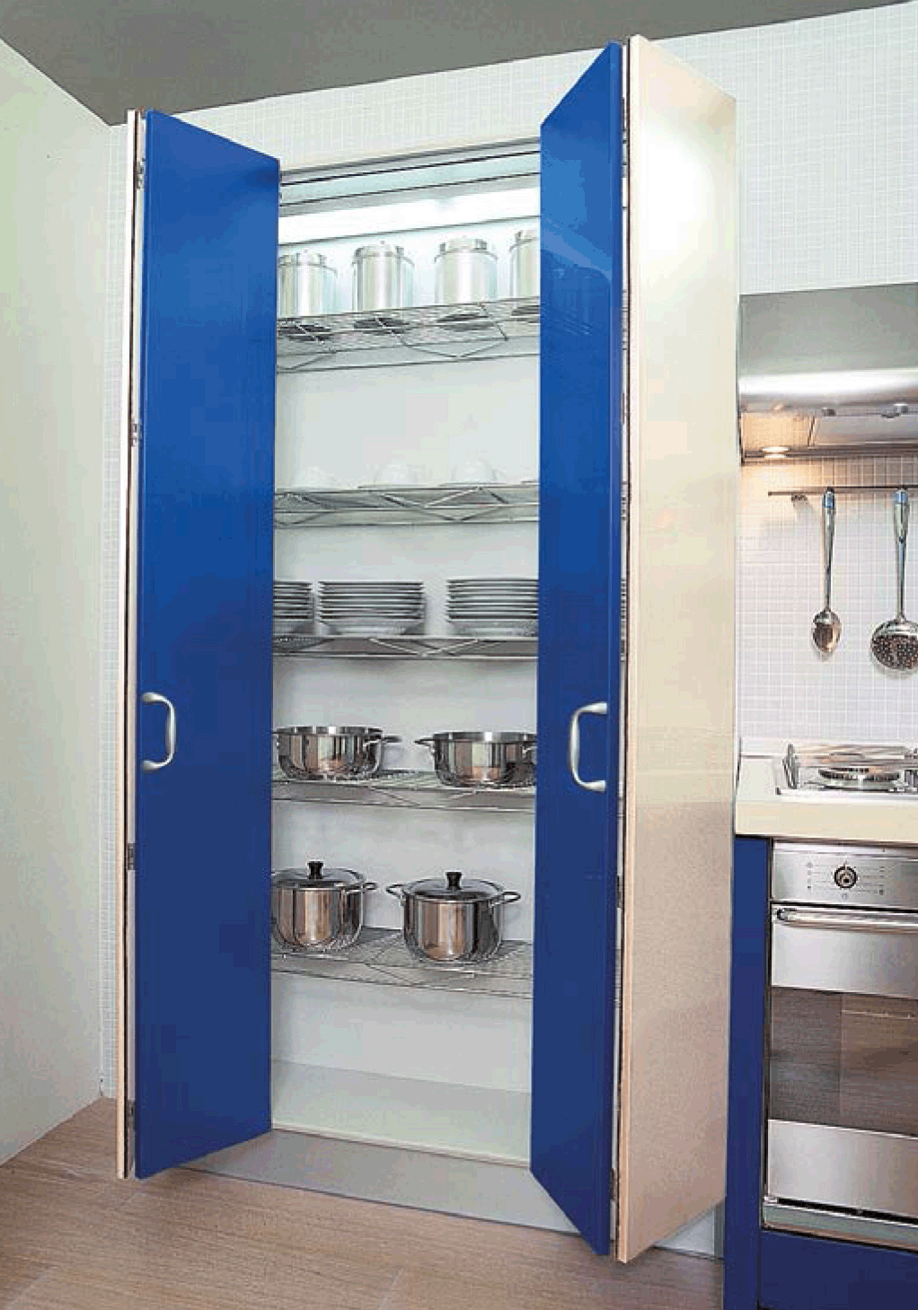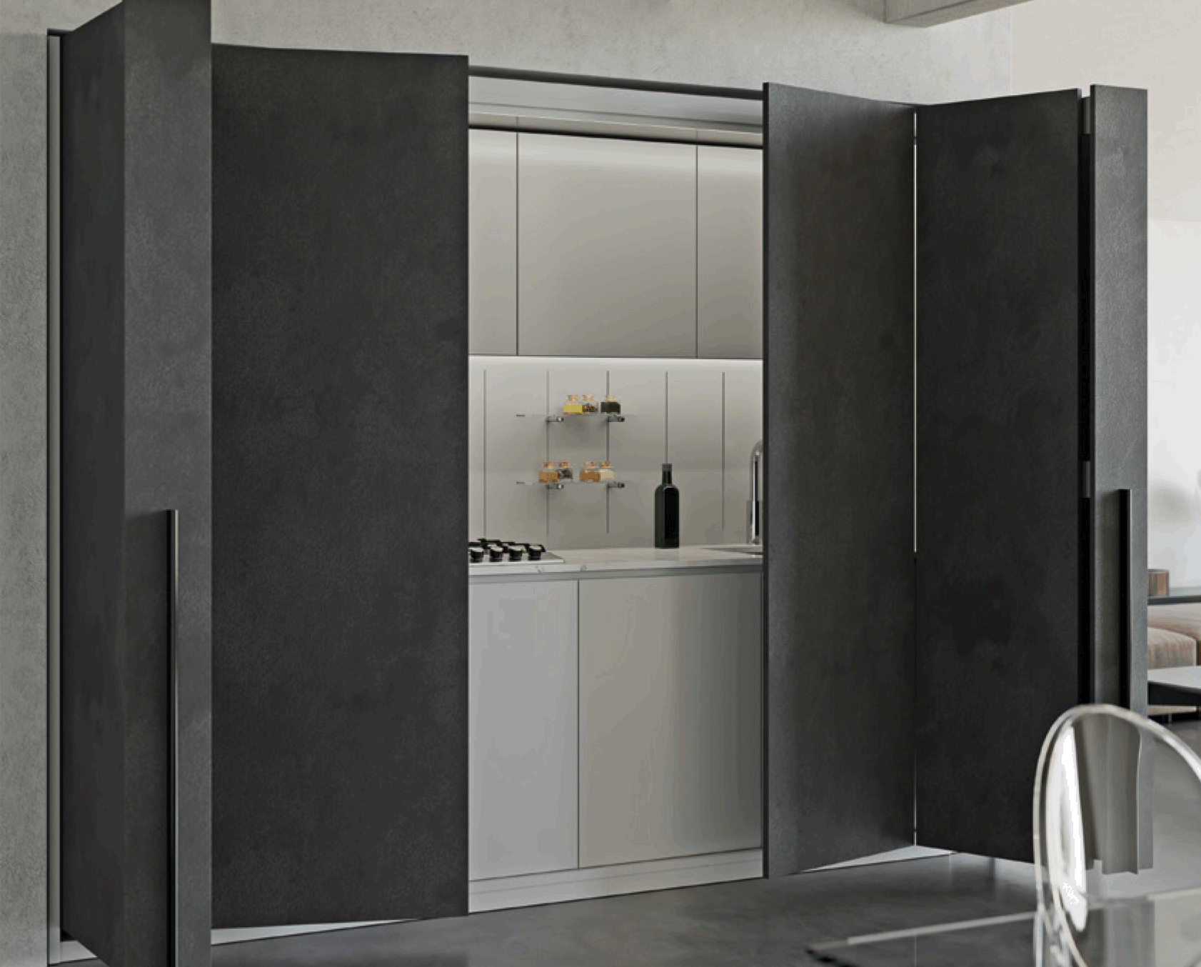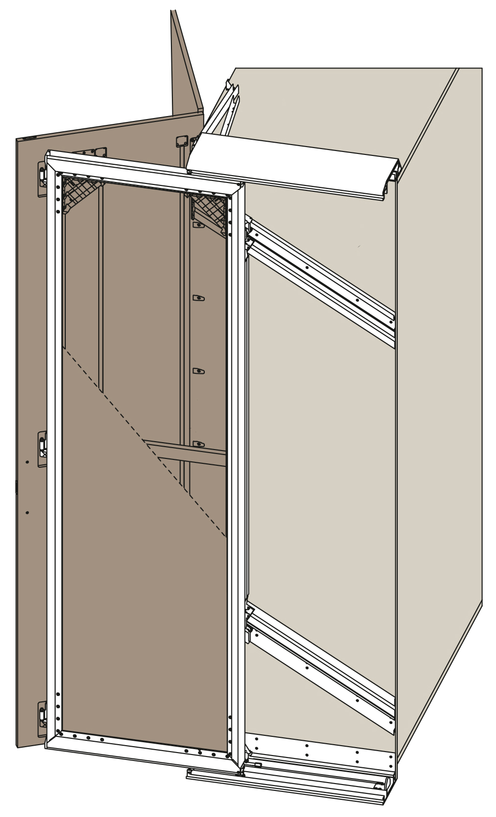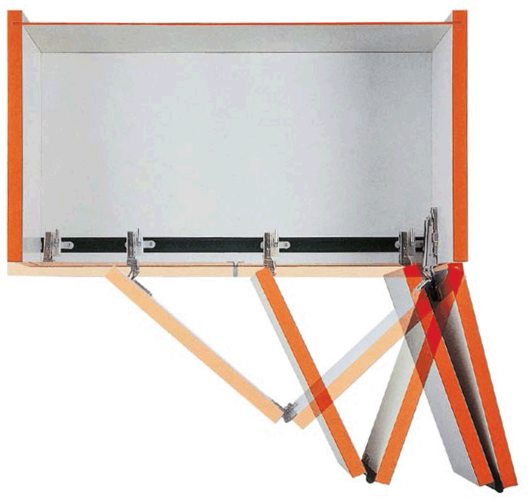 The Salice system for concertina doors has been designed to open both doors on one side only, giving good access to the interior of the cabinet. Space taken up by the door in the maximum open position is reduces to minimum (approximately 80mm). |