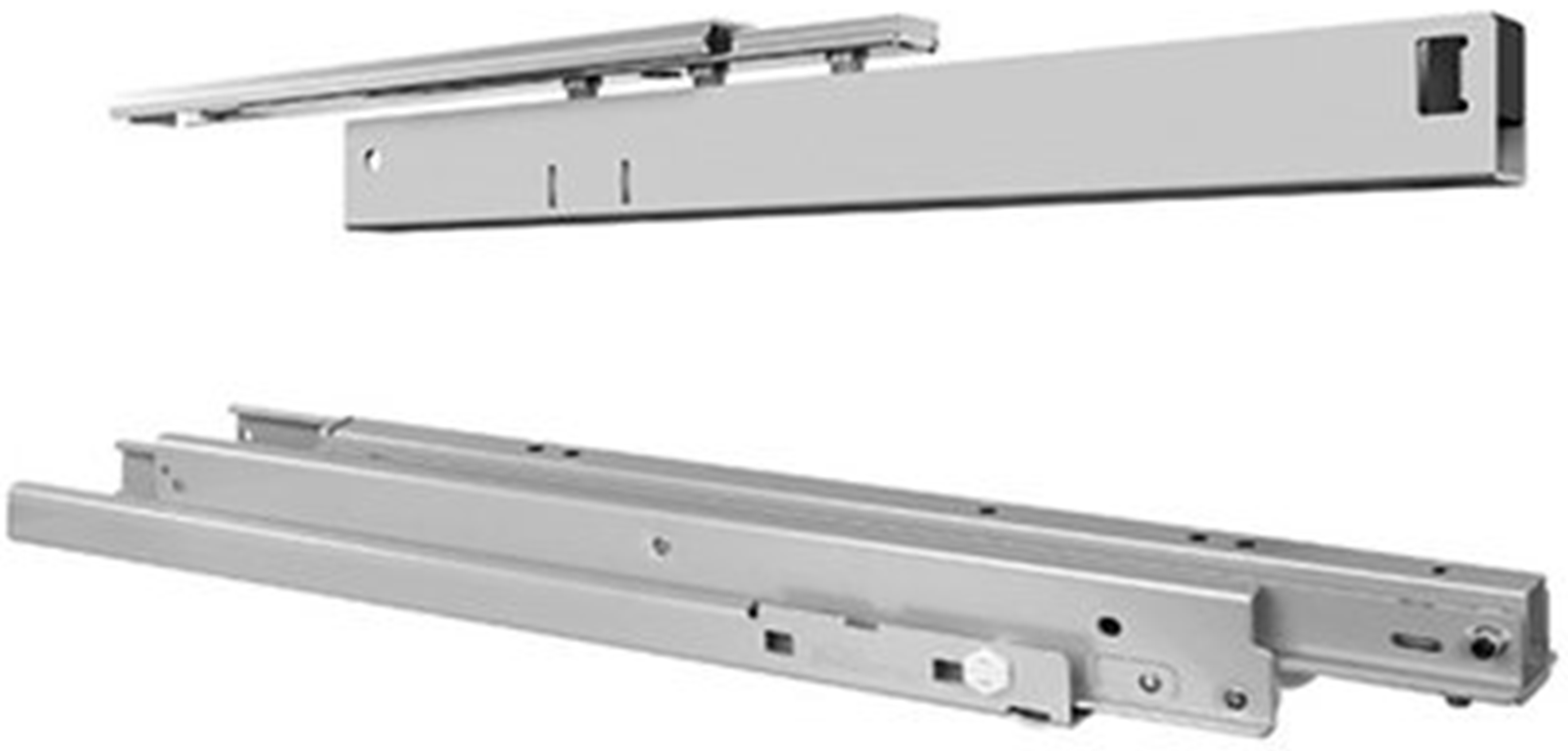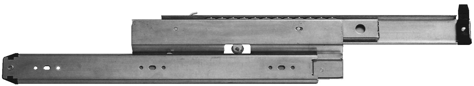 Side mounted. Full extension. Unhanded trigger release. 1/2" side spacing. Load rating 100 lbs based on 18" Slides. |