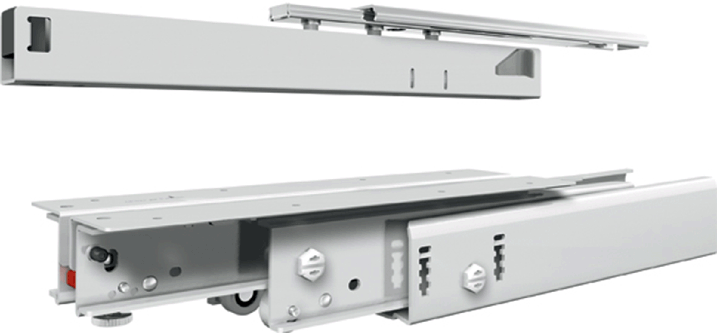 32mm hole pattern with direct access mounting. Lever disconnect for easy drawer removal. Hold-out feature allows slide to be held in place when drawer is open. Telescopic movement on ball bearings. |