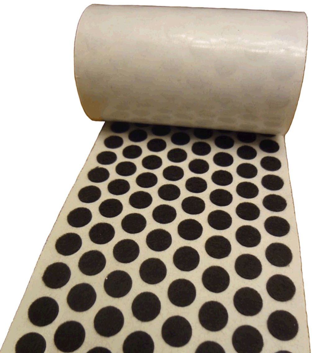 | 1/2" Specialty Quiet Bumper. .50" wide x .14" thick. Stocked in clear. 200/Sheet Packed 5,000 per box. Part Number: 7129BS58SD |