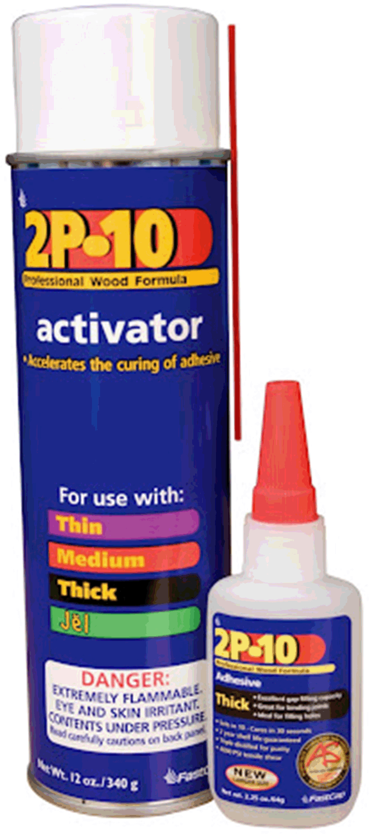 | 2P-10™ is a two-part ten-second adhesive. Just apply the adhesive, then spray the activator and stick it together for a strong, permanent bond. Its greatest benefits are its speed and strength. | ||||||||||||||||||||||||||||||||||||||||||||||||||||||||